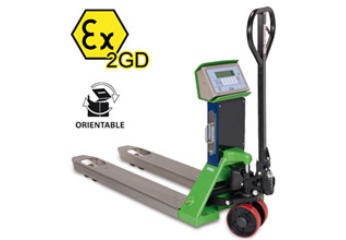 Transpaleta en acero inoxidable con pesaje electrónico integrado para áreas peligrosas clasificadas con riesgo de explosión (zonas 1 y 21 & 2 y 22) con modo de protección según Ex II 2G IIB T4 T197°C X.